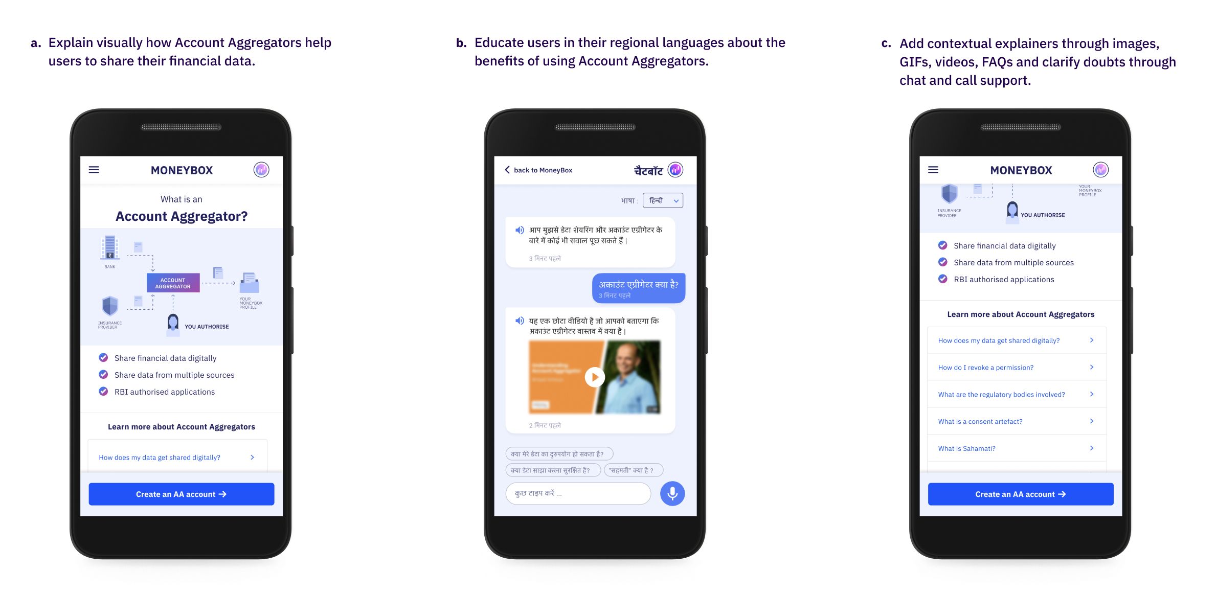Educate your users with a short introduction about what Account Aggregators (AA) are and how they function. Break down the educational material into shorter snippets and surface them contextually to reduce cognitive load. For low literacy users, increase accessibility to the provided information by converting them into images, audio, video.