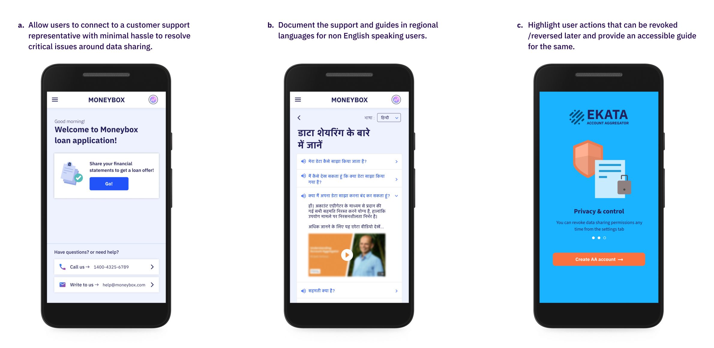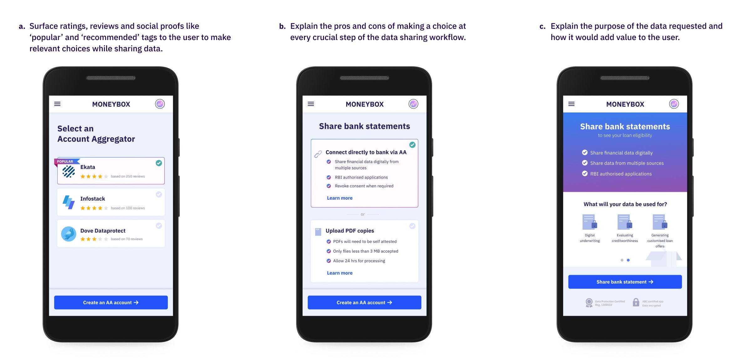 In this report, we have illustrated a fictional personal loan application called Moneybox which uses a fictional account aggregator called Ekata. The account aggregator will be used to share bank statements to disburse loans.