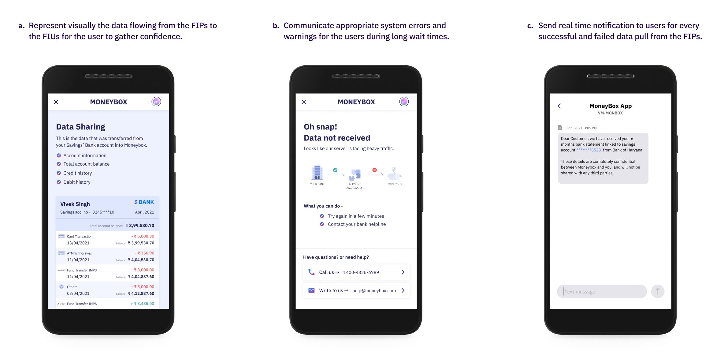 *Provide visual cues about the kind of financial information that is being pulled from the FIPs. Communicate reasons for errors and waiting time during the data sharing. Pinpoint the system responsible for the delay and further actionable that a user could perform to resolve it. Enable double confirmations at touchpoints where the user makes critical decisions. Notify the user every time whether the data being pulled is successful or not. *
