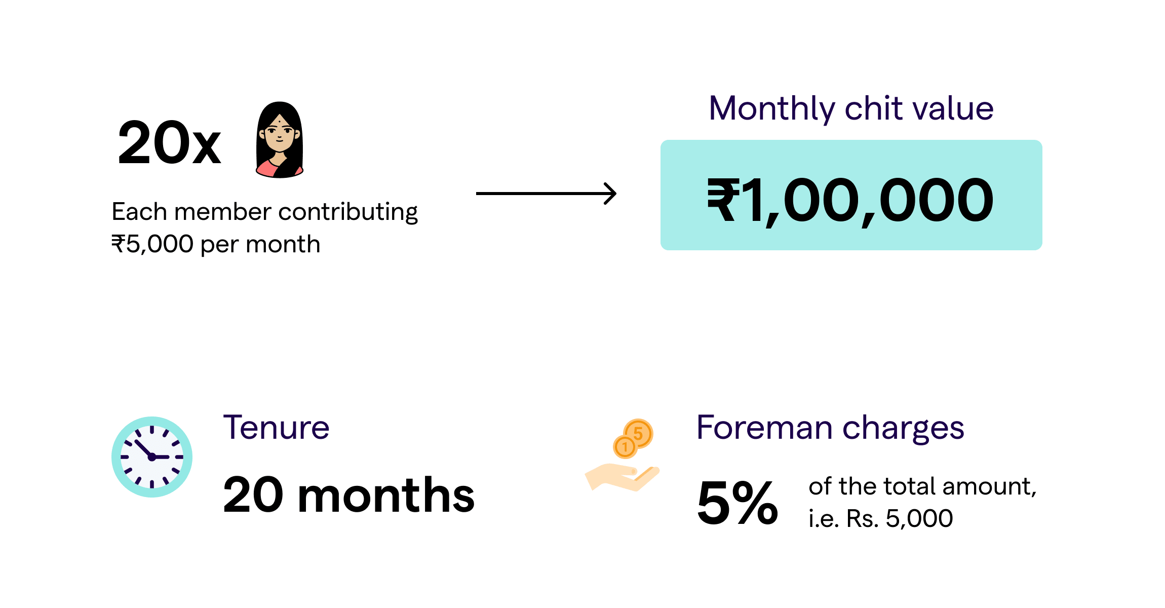 Let’s say there are 20 people in your society who want to come together and form a chit-fund group. Let’s name this group “Chitters”. Each member of chitters wants to save ₹ 5,000 in cash and preferably every month. They wish to invest for around two years but would also like the flexibility of withdrawing a lump sum in case they need the money for any reason. A rule of thumb for chit funds is that the number of group members is equal to the tenure of that chit fund. This ensures that every month one person can bid for the lump sum amount.