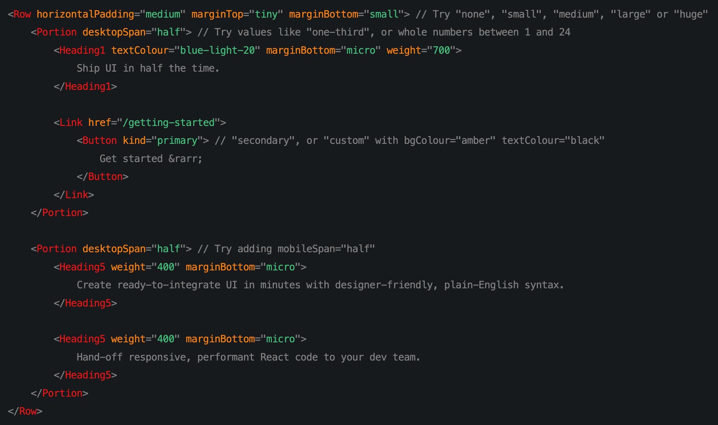 Fictoan is built in such a way that the UI code is very similar to how a designer would configure a component in Figma or Sketch — and the resulting syntax is extremely familiar, and not scary at all. For example —