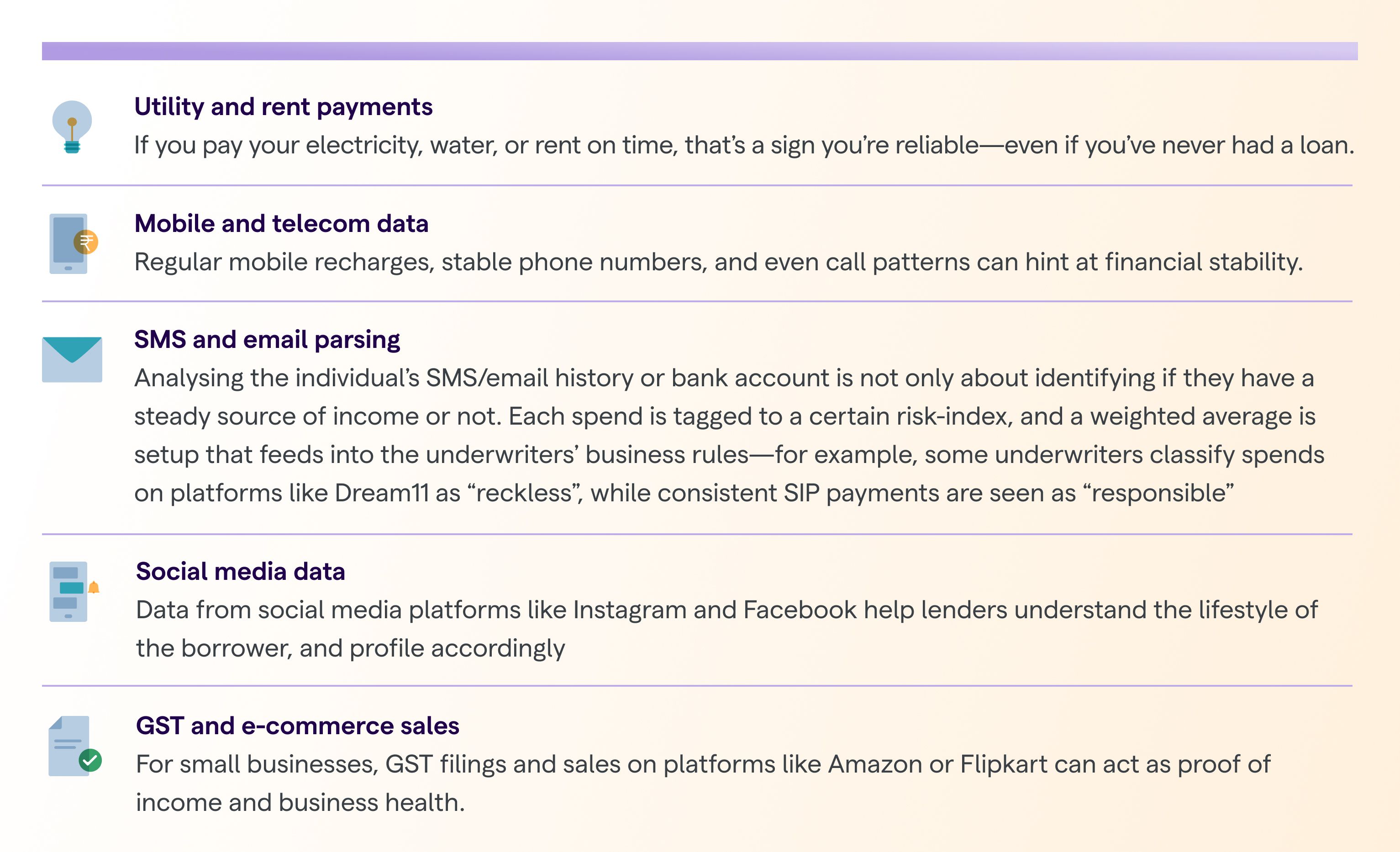 Here’s just a handful of alternative data points that may be used to underwrite.