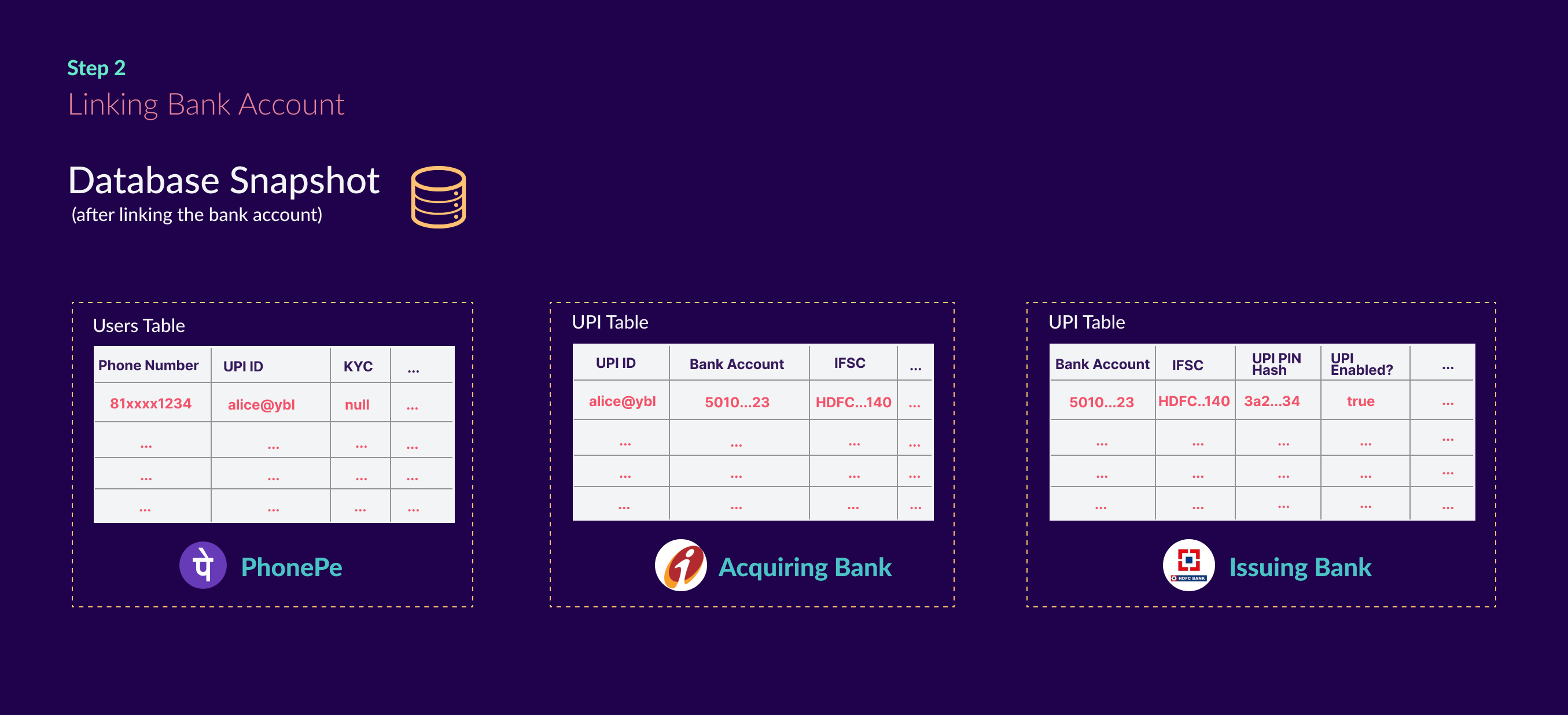 At the end of registration, this is how the databases look across the Issuing Bank, Acquiring Bank, and the payment app.