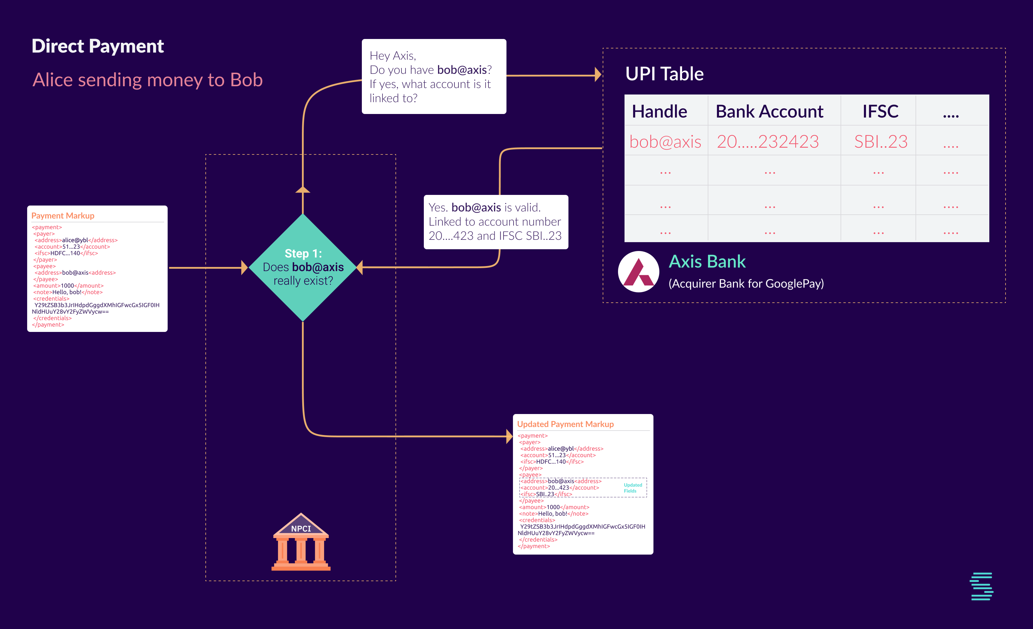 NPCI also needs to make sure that bob@axis exists and is linked to a bank account. That’s because UPI allows for transient payment addresses. Hence, the verification is mandatorily done so that we don’t end up in a situation where money gets debited from Alice’s account but no account to credit that money into.