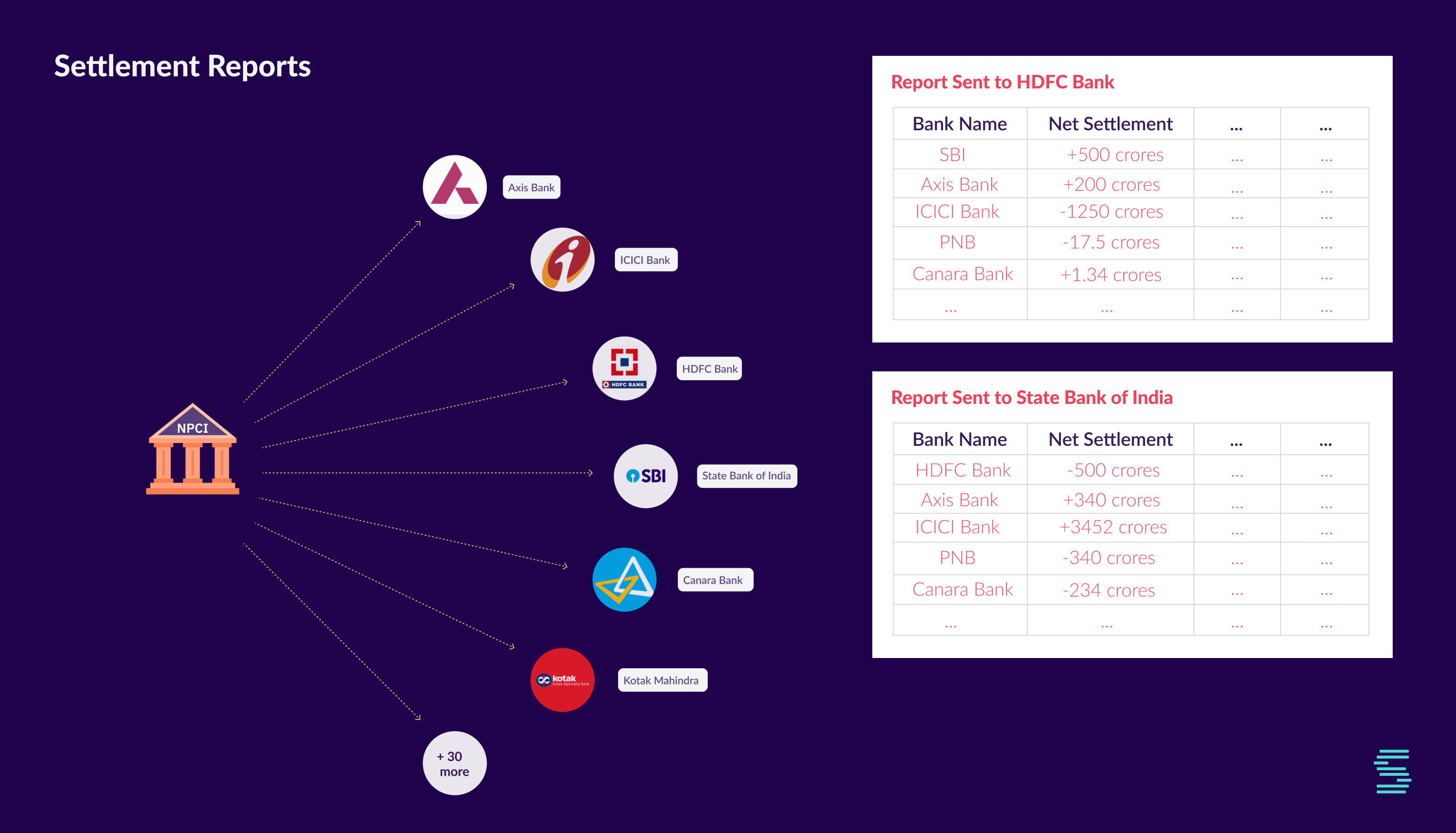 In the example we saw, Alice sent Rs. 1000 to Bob. Over time, many more transactions happen. Once in few hours, NPCI combines all the transactions that happened during the last period and creates a bulk settlement file. It creates settlement reports that are customized to every bank and sends it to every member bank involved. All banks do an internal computation to find how much do they owe someone or how much some other bank owes to them.
