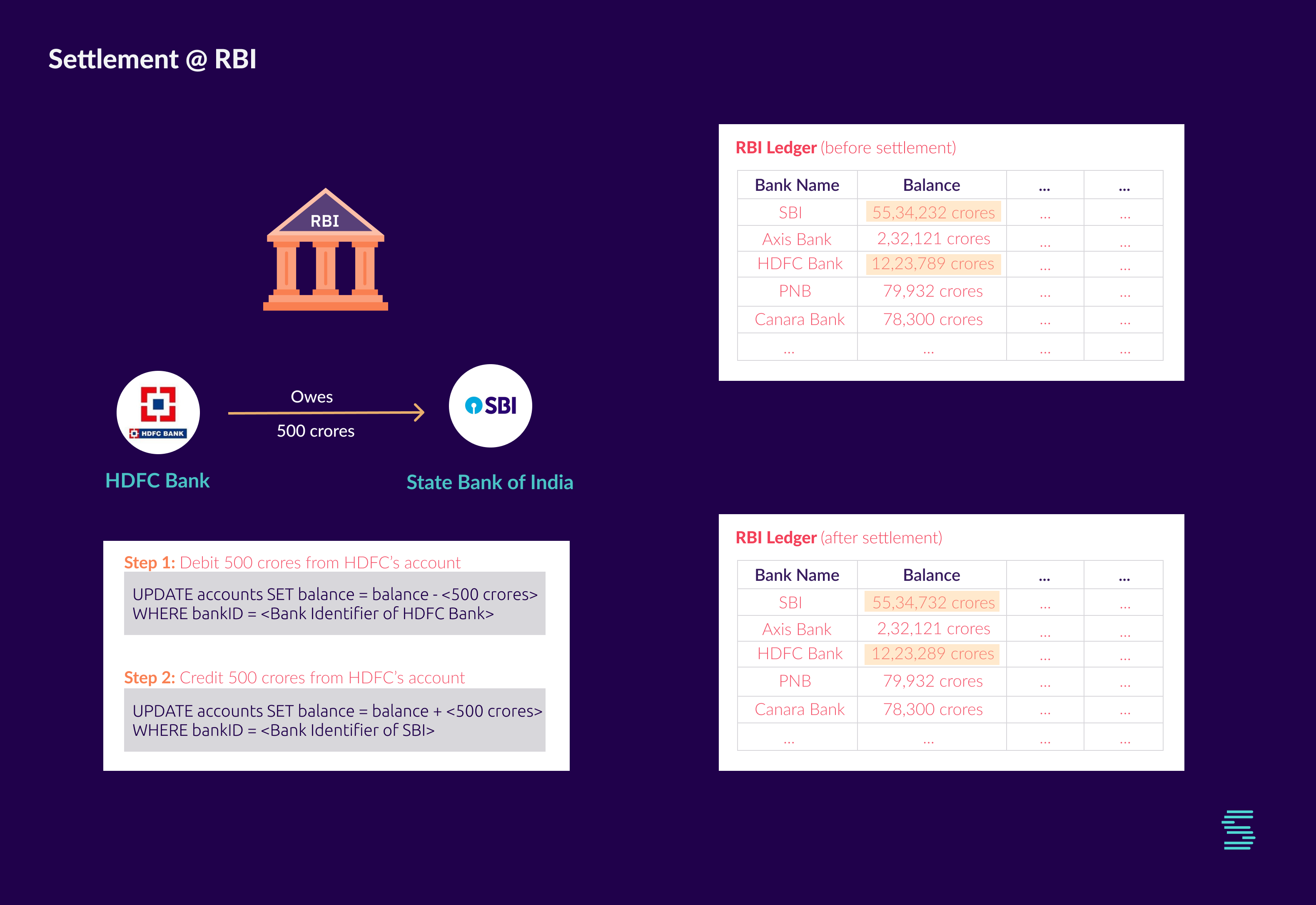 If we recall, both HDFC and SBI have accounts with the RBI (the bank of banks). Now, HDFC issues an authorization to RBI to transfer 500 crores from its account and credit it to SBI’s account. RBI checks the authorization and finally updates the ledger.